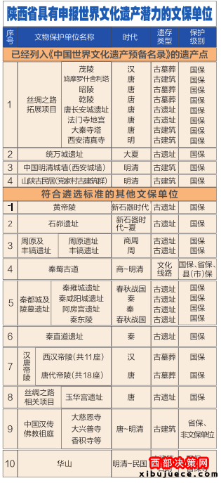 依據(jù)世界申遺遴選標準,結(jié)合陜西省遺產(chǎn)實際狀況與保護現(xiàn)狀,選定了兩大類文物點,第一類是已經(jīng)列入《中國世界文化遺產(chǎn)預備名單》的文化遺產(chǎn),共4處16個文物點;第二類是《陜西省申報世界文化遺產(chǎn)工作規(guī)劃》列入的擬申報遺產(chǎn)點,包括漢唐帝陵、石峁遺址、黃帝陵、周原及豐鎬遺址、秦蜀古道(蜀道)、秦都城及陵墓遺址、玉華宮遺址、秦直道遺址、中國漢傳佛教祖庭、華山等10處44個文物點。