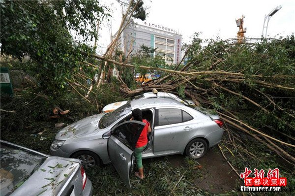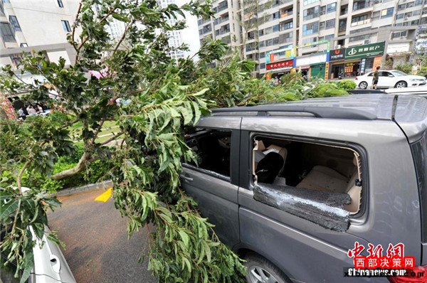 9月15日,今年第14號臺風(fēng)“莫蘭蒂”于凌晨3時(shí)05分在廈門翔安沿海登陸,登陸時(shí)中心附近最大風(fēng)力15級(48米/秒,強(qiáng)臺風(fēng)級),中心氣壓945百帕。圖為廈門市區(qū)大批車輛被吹倒的樹木損壞。