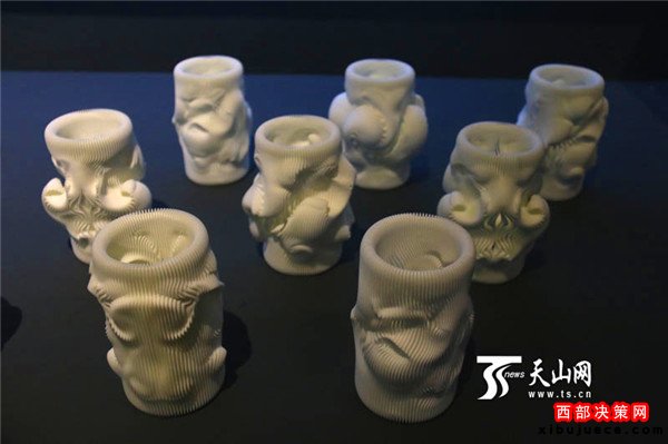 3D打印是近年來受熱捧的一門高科技,本屆雙年展自然少不了它的身影。展品《3D打印婚禮》展示的都是常見的婚慶用品,比如燈具、喜糖盒、餐具、首飾、婚紗等。不同的是,這些細(xì)小而美好的物件都是通過3D技術(shù)打印所制成。同樣運(yùn)用3D打印技術(shù),《46號(hào)花瓶》是一組由聲音雕塑而成的器物。創(chuàng)造者的聲音被收錄、解碼、編碼后通過計(jì)算程序打印出不同形態(tài)的花瓶。