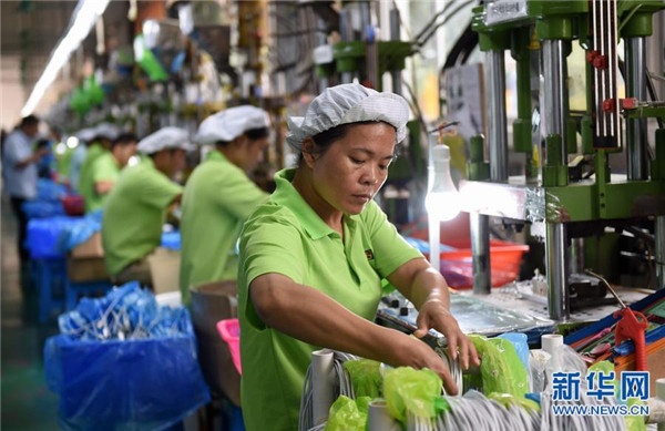 廣西都安瑤族自治縣農民進城創(chuàng)業(yè)園一家企業(yè)的工人在生產(chǎn)作業(yè)中。