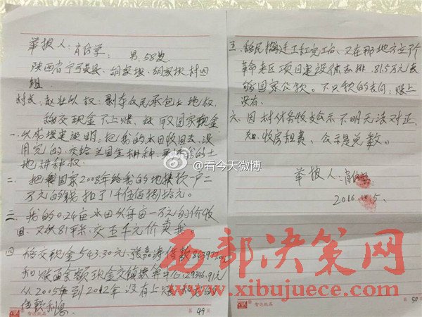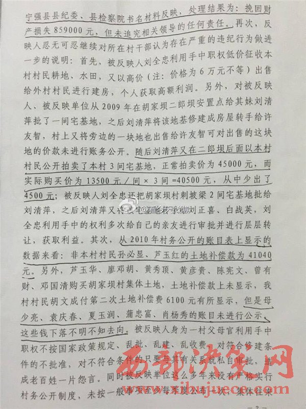西部決策網(wǎng)訊 近日,有網(wǎng)友微博爆料,陜西省漢中市寧強(qiáng)縣胡家壩鎮(zhèn)胡家壩村,村干部劉全忠利用惠民政策,套取國家大量資金。對(duì)于國家扶貧項(xiàng)目,巧立名目、貪污、侵占村民利益。濫用職權(quán)違規(guī)審批宅基地,倒賣村集體土地,并將村上千萬余元出借他人賺取利息,且村務(wù)不公開、賬務(wù)弄虛作假、嚴(yán)重違紀(jì)行為。