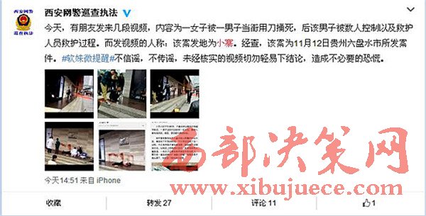 11月14日下午,在許多西安市民的朋友圈傳播幾段視頻,內(nèi)容為一女子被一男子當(dāng)街用刀捅死,后該男子被數(shù)人控制以及救護(hù)人員救護(hù)過程。經(jīng)西安網(wǎng)警鑒定,該案件為11月12日發(fā)生在貴州省的案件,并非西安。