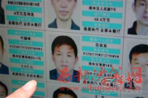 16日上午,在商洛市區(qū)北新街廣場等7處人口密集地段張貼著帶有32名被執(zhí)行人大頭照的公告,引來不少人圍觀。“老賴榜”上有一人,盡管未寫明具體單位身份,但不少市民還是認出來了。“那不是安監(jiān)局的呂副局長嗎?欠了人家280多萬元呢。”圍觀人群中有人說。
