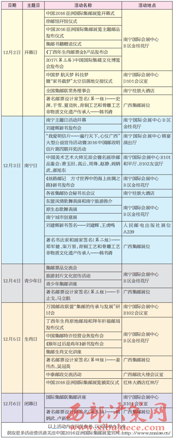 中國(guó)2016亞洲國(guó)際集郵展覽即將于12月2日—6日在南寧舉行,除了精彩的競(jìng)賽性和非競(jìng)賽性展品,郵展期間還將舉辦生肖郵票展示和主題郵局展示等相關(guān)活動(dòng)。展會(huì)還特別設(shè)定了開(kāi)幕日、南寧日、青少年日、生肖日、閉幕日五個(gè)主題日,下面就來(lái)看看每個(gè)主題日都有哪些豐富的活動(dòng)吧。