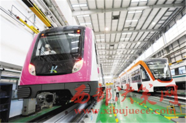 在生產(chǎn)車間,記者看到,3號線列車以粉紅色和白色為主要基調(diào),6號線列車以藍色和白色為主要基調(diào)。和昆明已經(jīng)投入運營的列車一樣,剛出爐的列車也是B型車,車頭上同樣標(biāo)有代表昆明的字母“K”,而且有著軌道樣式的變形。值得一提的是,昆明中車公司正在調(diào)試的3號線此前已和市民見過面,而此次亮相的6號線列車可以說是首次出現(xiàn)在公眾視野,因為此前6號線運行使用的列車是從1、2號線首期調(diào)用的。