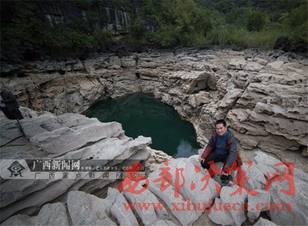 采訪團(tuán)成員在一處地下河天窗前留影。