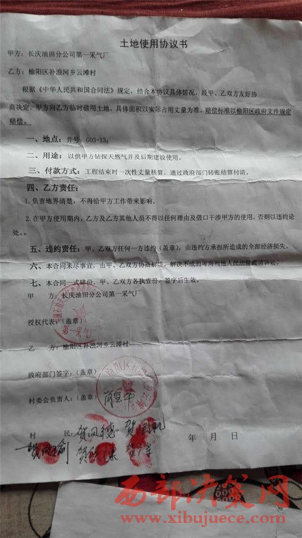 日前,陜西榆林榆陽區(qū)補浪河一村民反映,長慶油田采氣一廠在他們村征地鉆探天然氣井,村民懷疑長慶采氣一廠和他們村委會簽定的《土地使用協(xié)議書》存在著嚴重的問題。村民向記者看了一份所謂的巜土地使用協(xié)議書》,記者看到這份漏洞百出的協(xié)議書,協(xié)議書的甲方是長慶油田采氣一廠分公司,而協(xié)議書公章是中國石油天然氣長慶股份有限公司(……)分公司,幾個關(guān)鍵的字根本看不清楚,不知道這個沒有蓋清楚公章的協(xié)議書到底想掩蓋什么?還是這枚公章就是一枚假公章。協(xié)議書的甲方名稱為什么和公章名稱不符呢?