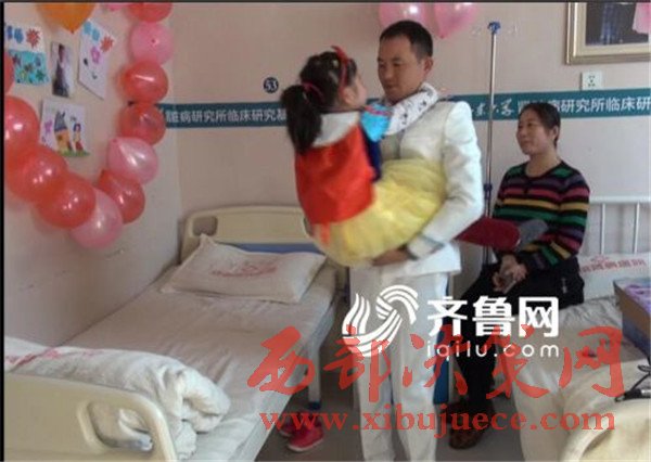 這個(gè)6歲女孩穿上了最喜歡的公主泡泡裙,與父親史新站手拉手,伴隨著婚禮進(jìn)行曲走進(jìn)病房。