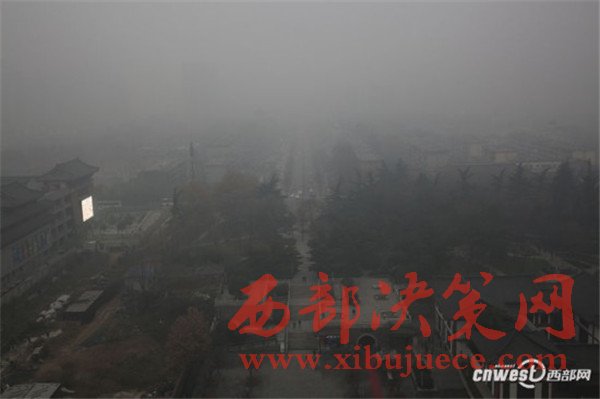 12月20日,西安市空氣質(zhì)量指數(shù)接近500,空氣質(zhì)量嚴(yán)重污染,昨日西安市首次啟動(dòng)重污染天氣Ⅰ級(jí)應(yīng)急響應(yīng),今日繼續(xù)執(zhí)行重污染天氣Ⅰ級(jí)應(yīng)急響應(yīng),幼兒園、中小學(xué)停課,機(jī)動(dòng)車限行50%。重度霧霾的大雁塔失去了千年古色,稍遠(yuǎn)一點(diǎn)看大雁塔若隱若現(xiàn),再走遠(yuǎn)一點(diǎn)大雁塔在視線中消失。登上大雁塔頂層,從東南西北四個(gè)窗口拍下的照片幾乎一模一樣。