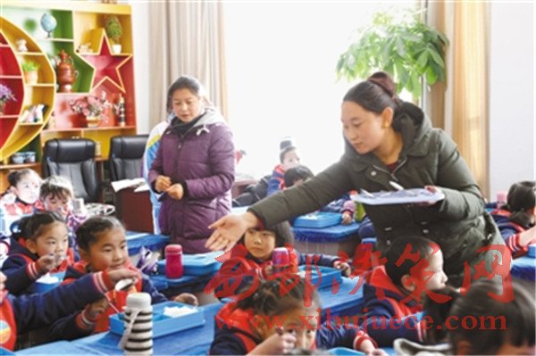 拉薩市城關(guān)區(qū)第二小學的家長代表正在給學生發(fā)放營養(yǎng)午餐。