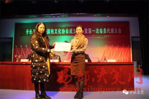 在會上,山丹丹旗袍文化協(xié)會的負責人白潔做了協(xié)會前期籌備工作的簡述,文廣局副局長宣讀了同意子長縣山丹丹旗袍文化協(xié)會成立的批復;民政局副局長趙和平頒發(fā)社會團體登記證。會中還進行了對協(xié)會的理事會,監(jiān)事會,主席團成員的選舉。當選為協(xié)會主席的白潔在會上做了表態(tài)發(fā)言,并代表協(xié)會向協(xié)會的顧問李建中、王明如,名譽主席王晶、張琴頒發(fā)了聘書。最后,協(xié)會會員還為觀眾們準備了一道文藝表演的盛宴,大會在星光大道歌手孫秸的一曲《山丹丹開花紅艷艷》中勝利中閉幕。