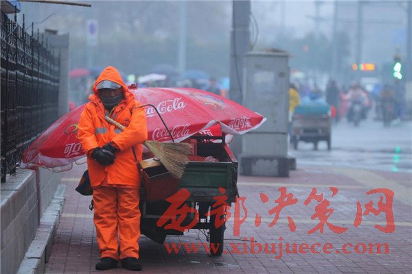 2016年12月26日一早,山東濟南,天空中飄著細細的雪花,一位環(huán)衛(wèi)工人靠在路邊站著睡著了,記者看到,這名環(huán)衛(wèi)工人還懷抱掃把和簸。