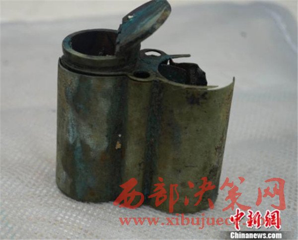 圖為“呂義泰白銅壽紋水煙袋”,缺水斗、吸管。外筒上下口沿云雷紋,中腹團(tuán)壽紋。煙倉(cāng)內(nèi)蓋上刻有“漢鎮(zhèn)呂義泰劉盛”字樣。寬8.8,殘高8.8 ,單筒徑4.1厘米。“丹東一號(hào)”水下考古隊(duì)供圖