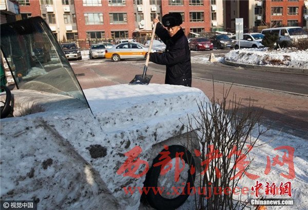 1月3日,吉林省長春市,六旬保安組團(tuán)建雪雕汽車,上車下車用啤酒箱當(dāng)踏板。