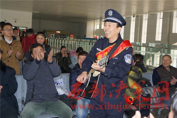 1月11日,新疆哈密鐵路公安處警的民警黨新海在哈密站為旅客彈唱新疆民歌。