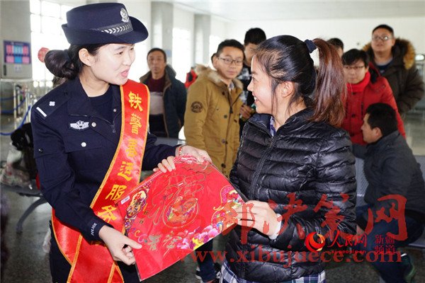 1月11日, 新疆哈密鐵路公安處的民警在哈密站為旅客送“福”。