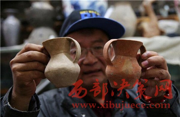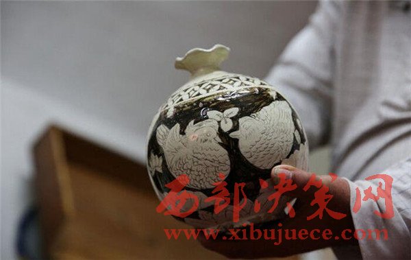 2016年9月23日,陜西榆林,“這件是遼代的石榴樽,你看上面的鴛鴦多漂亮。”劉福學打開他的木箱,向來客展示他的藏品。