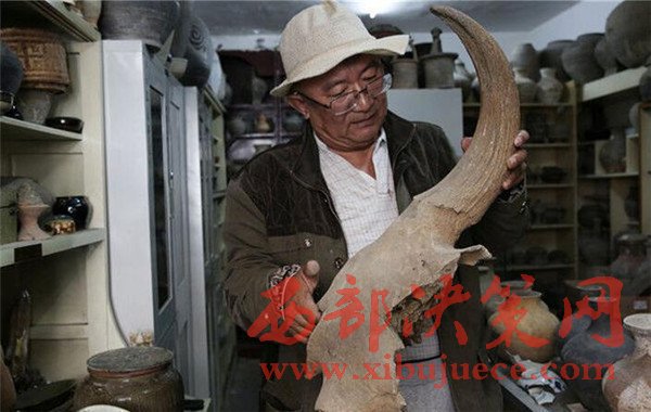 2016年9月23日,陜西榆林,原始牛牛角化石有40多斤重,劉福學猜測,20萬年前的原始牛有現(xiàn)在的牛20頭大,起碼有10噸。