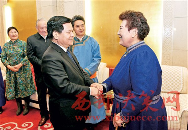 1月16日晚,自治區(qū)黨委書記李紀恒在觀看大型蒙古族歌劇《愛在胡楊》演出前,接見了總策劃德德瑪?shù)染巹?chuàng)人員。