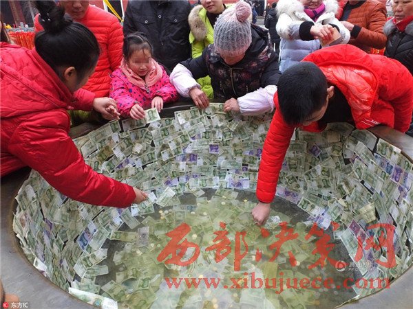 2017年2月,正月迎財(cái)神、拜財(cái)神。在湖北宜昌當(dāng)陽玉泉寺,眾多香客向玉泉寺內(nèi)的巨型銅缸里投幣、在銅缸壁上貼幣祈福。