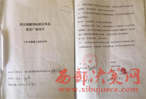 西部決策網(wǎng)訊(王博 通訊員 王德)近期,我社不斷接到汪衛(wèi)宏來電、來信稱;2014年4月底,鼎立建設(shè)集團股份有限公司西安分公司找到我;讓我?guī)Чと嗽?lsquo;西安錦鵬國際酒店用品批發(fā)廣場項目’干水、電安裝,至今拖欠民工一百多萬工資款;發(fā)包方和業(yè)主雙方相互推諉。
