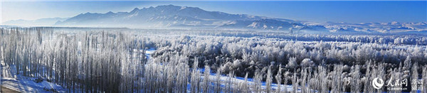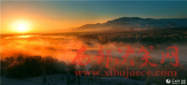 綿延百里的新疆尼勒克縣喀什河谷次生林在冷空氣的作用下,霧氣蒸騰,21萬(wàn)畝林帶凝成了玉樹瓊花的霧凇景觀。迎著日出的霞光,從山上向下俯視,整個(gè)河谷云蒸霞蔚,宛如置身云端。翻滾的云海讓遠(yuǎn)山和近樹若影若現(xiàn),恍若仙境。待太陽(yáng)升高,再浮現(xiàn)河谷次生林帶,猶如一條晶瑩剔透的玉帶飄落在天山之下。