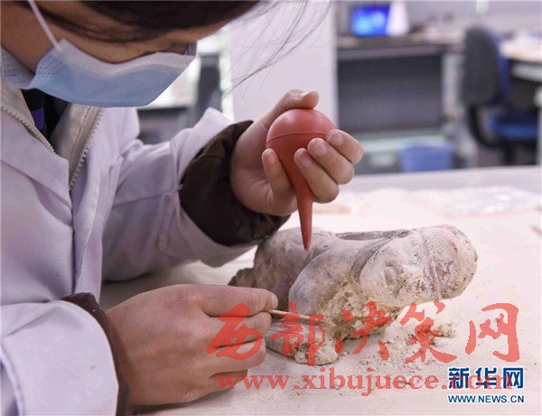 2月27日,成都考古研究所文物保護(hù)與修復(fù)中心工作人員在對(duì)出土的匍匐俑進(jìn)行清理