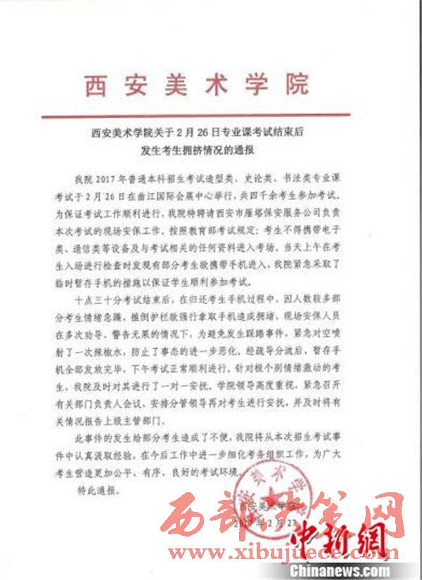 西安美術(shù)學(xué)院發(fā)布的事件通報(bào)稱,考試結(jié)束后,在歸還手機(jī)過程中,因人數(shù)較多部分考生情緒急躁,推倒護(hù)欄欲強(qiáng)行拿取手機(jī)造成擁堵,現(xiàn)場(chǎng)安保人員在多次勸導(dǎo)、警告無果的情況下,為避免發(fā)生踩踏時(shí)間,緊急對(duì)空噴射了一次辣椒水,防止了事態(tài)的進(jìn)一步惡化。經(jīng)疏導(dǎo)分流后,暫存手機(jī)全部發(fā)放完畢,下午考試順利進(jìn)行。針對(duì)個(gè)別情緒激動(dòng)的考生,該院即使對(duì)其進(jìn)行了一對(duì)一安撫。學(xué)院領(lǐng)導(dǎo)高度重視,緊急召開有關(guān)部門負(fù)責(zé)人會(huì)議,安排分管領(lǐng)導(dǎo)再對(duì)考生進(jìn)行安撫,并及時(shí)將有關(guān)情況報(bào)告上級(jí)主管部門。此事件的發(fā)生給部分考生造成了不便,該院將從本次招生考試事件中認(rèn)真汲取經(jīng)驗(yàn),在今后工作中進(jìn)一步細(xì)化考務(wù)組織工作,為廣大考生營造更加公平、有序、良好的考試環(huán)境。