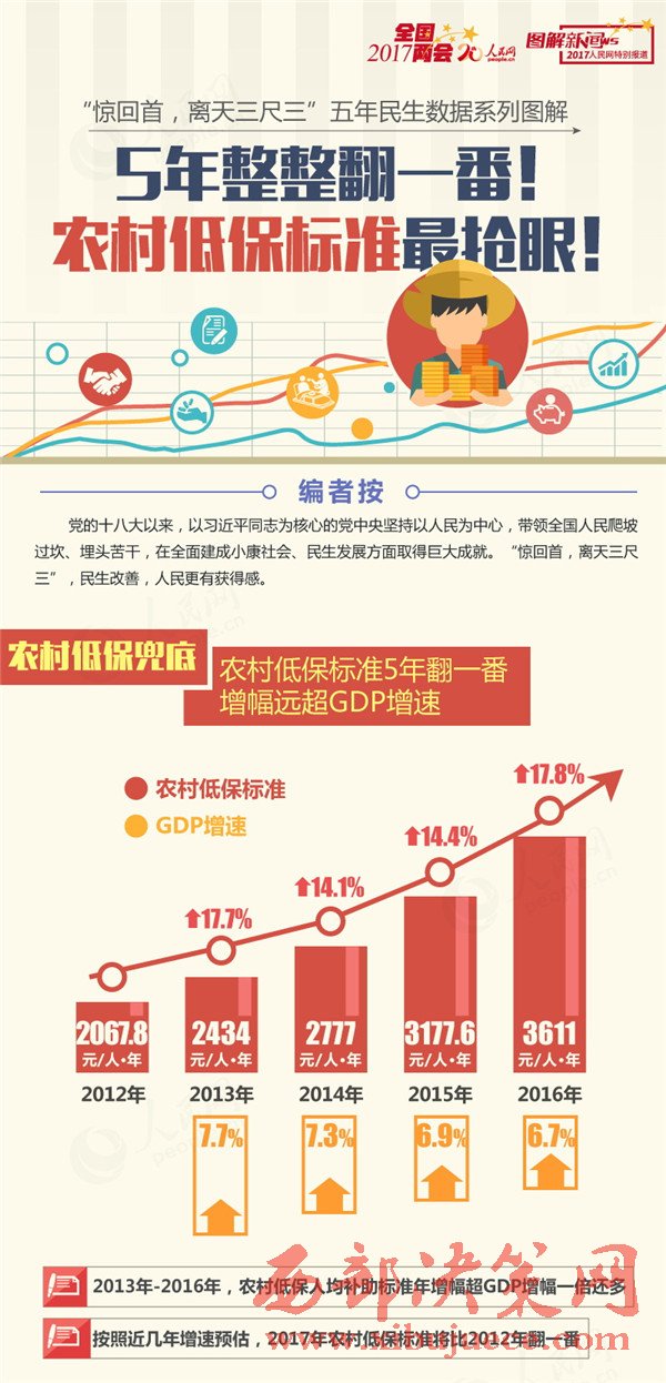 保障低收入群眾基本生活是黨和政府要著力解決好的基礎(chǔ)性工作,是民生保障網(wǎng)需要首先筑牢的“網(wǎng)底”。民政部公布的數(shù)據(jù)更加清晰地說明了問題:2067.8元,2434元,2777元,3177.6元,3611元……2012年至2016年農(nóng)村低保人均補助標準,每年的增幅遠遠超過GDP增速。按照近幾年增速預(yù)估,2017年農(nóng)村低保人均標準將比2012年翻一番。