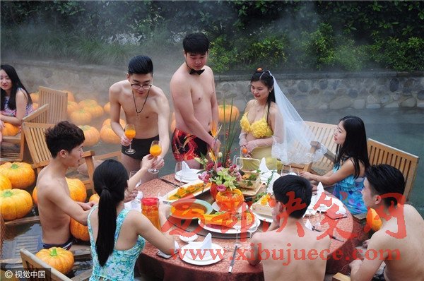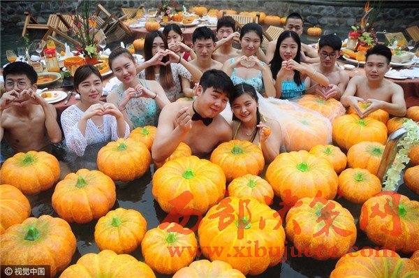 現(xiàn)場賓客都泡在溫泉里,婚宴食材都是用南瓜制成。