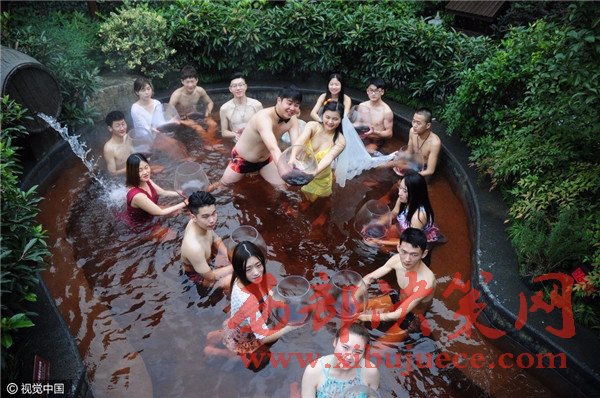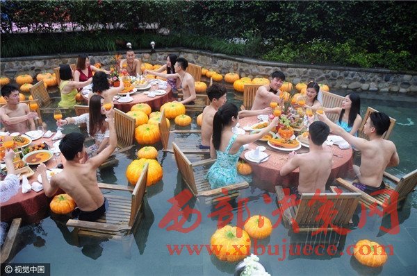 杭州現(xiàn)溫泉南瓜婚禮 新人賓客泳裝參加畫風奇特