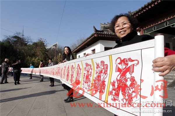 11月30日,在西安市蓮湖公園里,由民間剪紙藝人劉惠霞帶領(lǐng)6名殘疾人學(xué)員、3名志愿者,歷時(shí)一年多時(shí)間,創(chuàng)作的長22米、寬52厘米的《五十六個(gè)民族》巨幅剪紙作品。