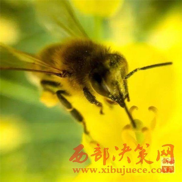一只蜜蜂在重慶長(zhǎng)壽區(qū)鄰封鎮(zhèn)的油菜花海采蜜。