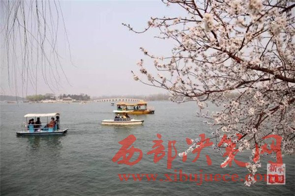游客們?cè)诒本╊U和園賞花。