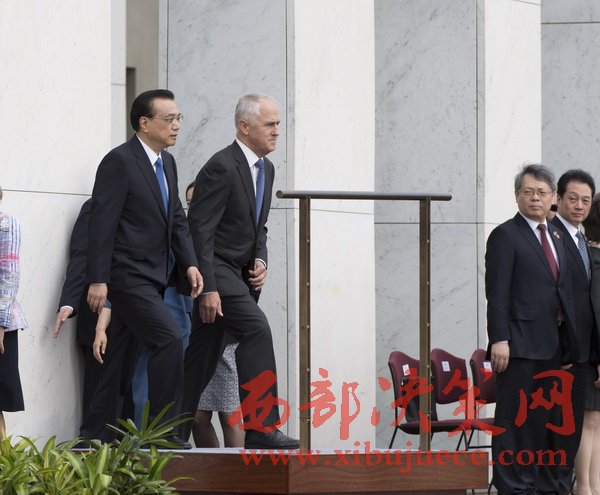 當?shù)貢r間23日上午,澳大利亞總理特恩布爾在堪培拉議會大廈廣場舉行隆重儀式,歡迎李克強總理對澳進行正式訪問。19響禮炮聲中,特恩布爾夫婦在下車處迎接李克強夫婦。廣場上奏響中國國歌,李克強檢閱了儀仗隊。兩國總理登上檢閱臺后,軍樂團再次奏響中澳兩國國歌。