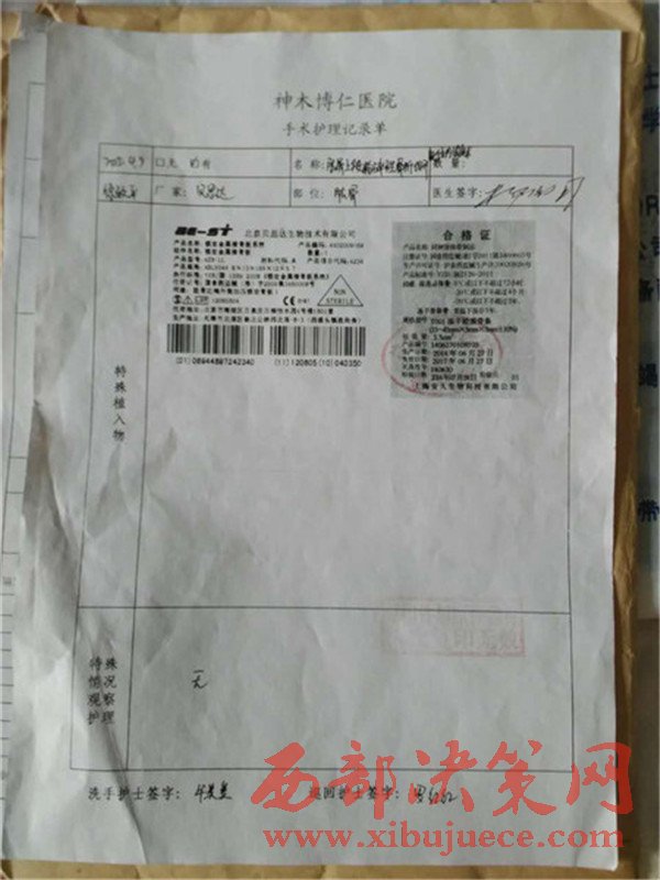 患者家屬將原來在博仁醫(yī)院住院的資料全部拿出來時發(fā)現(xiàn),大保當(dāng)博仁醫(yī)院當(dāng)時給患者做手術(shù)所用的鋼板可能存在問題,做手術(shù)所用的鋼板與當(dāng)時給患者提供的合格證書不符,在此期間家屬也找過原博仁醫(yī)院劉院長,所給的答復(fù)是他剛來不知道此事,董事長(賀玉剛)也說是在西安,你們先看病,回頭把鋼板拿過來,等鋼板廠家的人來了,我們?nèi)阶谝黄鹂丛趺唇鉀Q,就這樣一直拖著直到現(xiàn)在。