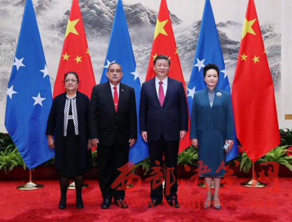 3月27日,國家主席習(xí)近平在北京人民大會堂同密克羅尼西亞聯(lián)邦總統(tǒng)克里斯琴舉行會談。會談前,習(xí)近平在人民大會堂東門外廣場為克里斯琴舉行歡迎儀式。這是習(xí)近平和夫人彭麗媛同克里斯琴總統(tǒng)夫婦合影。