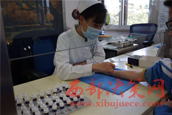 4月11日,北京大學(xué)世紀(jì)壇醫(yī)院變態(tài)反應(yīng)科化驗(yàn)室醫(yī)務(wù)人員在給患者做過敏源檢測。今年3月以來,這個(gè)科室就診人數(shù)從平時(shí)的日均100多人猛增到300多人。新華網(wǎng)韓家慧攝