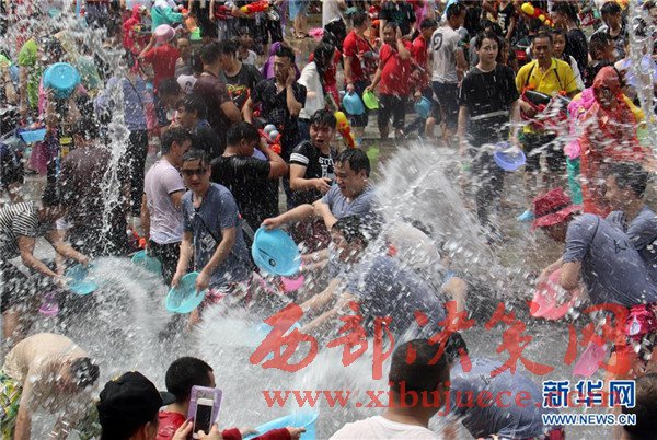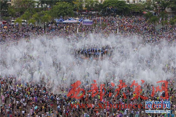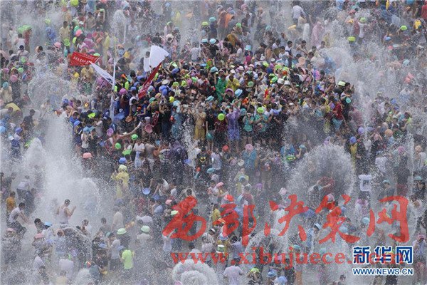 4月15日,人們在西雙版納景洪潑水廣場參加潑水狂歡。