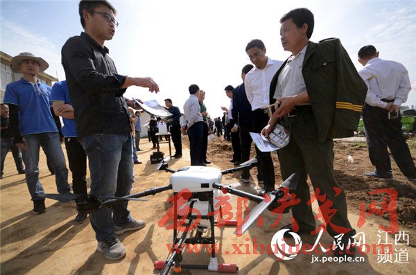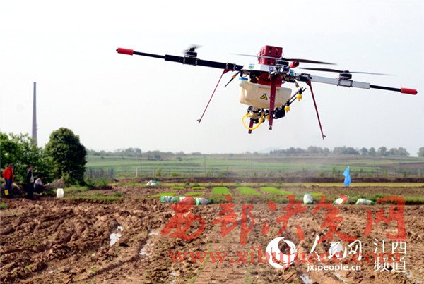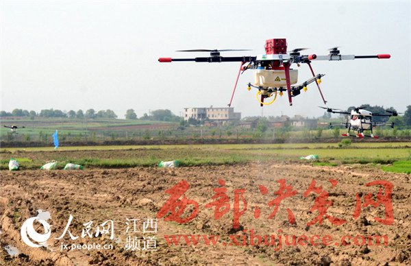 4月18日,江西省奉新縣宋埠鎮(zhèn)橋頭村奉新縣建華農(nóng)機(jī)合作社的稻田上空,數(shù)架無人機(jī)正在“嗡嗡”作業(yè),農(nóng)技員正在展示植保無人機(jī)噴灑農(nóng)藥的功能。