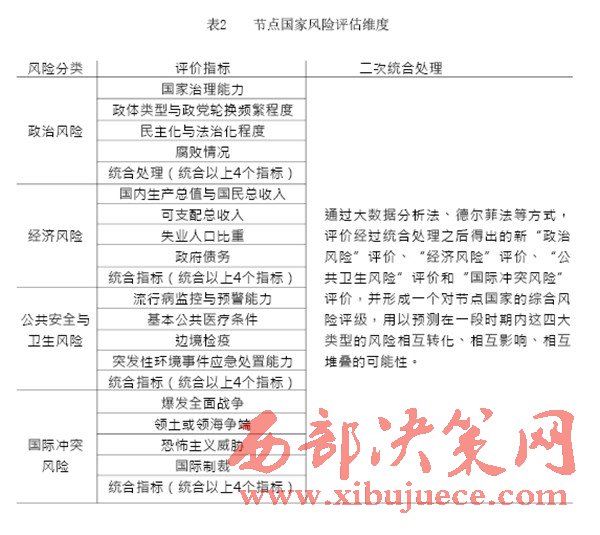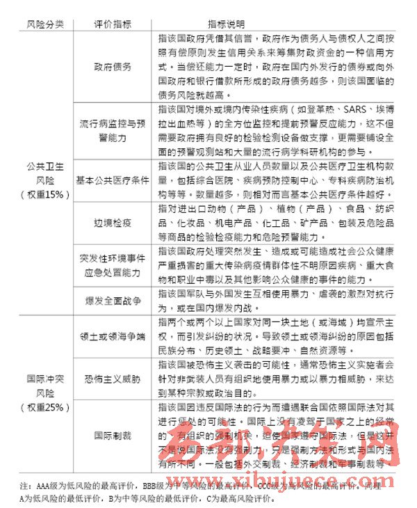 “一帶一路”建設(shè)中重要國家的治理風(fēng)險是我們的主要關(guān)注對象,在借助國內(nèi)外智庫和科研院所已完成的眾多研究成果的基礎(chǔ)上,建立一套對節(jié)點國家風(fēng)險的評級體系,如表1(見P28)所示。節(jié)點國家風(fēng)險評價指標(biāo)中,政治風(fēng)險與經(jīng)濟(jì)風(fēng)險的評價參考經(jīng)濟(jì)學(xué)人智庫的國家風(fēng)險模型(EIU country risk model);公共衛(wèi)生風(fēng)險的評價參考中國衛(wèi)生與經(jīng)濟(jì)社會發(fā)展統(tǒng)計數(shù)據(jù)庫對公共衛(wèi)生的指標(biāo)設(shè)計;國際沖突風(fēng)險評價根據(jù)經(jīng)濟(jì)學(xué)人智庫發(fā)布的白皮書《愿景與挑戰(zhàn)——“一帶一路”沿線國家風(fēng)險評估》與中國出口信用保險公司發(fā)布的2015年版《國家風(fēng)險分析報告》和《全球風(fēng)險地圖》綜合考量得出。具體而言,我們可以從“政治風(fēng)險”“經(jīng)濟(jì)風(fēng)險”“公共衛(wèi)生風(fēng)險”和“國際沖突風(fēng)險”四個維度來評估選擇出的節(jié)點國家的風(fēng)險,如表2(見P30)所示。