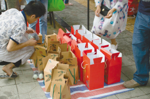 馬鞍東路“粽子江湖”的歷史大致要追溯到上世紀(jì)80年代。1980年,居住在馬鞍東路的李太婆,把自己包的粽子拿到院壩門口和附近的曹家巷農(nóng)貿(mào)市場(chǎng)賣,受到她的啟發(fā),“馬婆婆”周啟玉(隨夫姓,下同)拉著“梅婆婆”葉新芳和“任婆婆”張興碧籌劃起了粽子生意。那年開始,端午時(shí)節(jié),成都馬鞍東路的“婆婆粽”漸漸名聲在外。如今的馬鞍東路,到端午節(jié)前半個(gè)月就熱鬧開來。裁縫鋪、火鍋店、面館……臨街的商鋪都在這個(gè)時(shí)節(jié)改賣粽子。