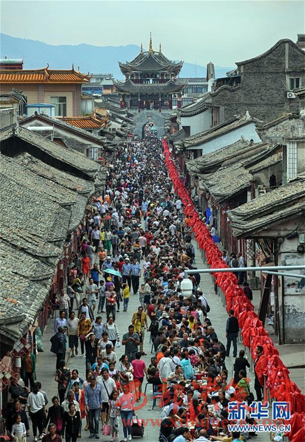 當(dāng)日是端午節(jié),四川省涼山彝族自治州會(huì)理縣會(huì)理古城舉行“萬(wàn)人藥根宴”,約1.5萬(wàn)人共同在古城內(nèi)1500張桌上就餐。