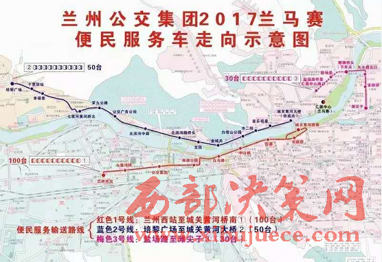 2號(hào)接送專線:賽事當(dāng)天早4:40時(shí)開始至6:30結(jié)束(路橋封閉之前),由培黎廣場(chǎng)始發(fā),不間斷開往北濱河路城關(guān)黃河大橋,途經(jīng):十里店、幸福巷、七里河黃河橋北、羅九公路、公交廣告、北濱河中路、龍?jiān)础⒔鸪顷P(guān)、白塔山公園、市二院、音樂噴泉、城關(guān)黃河大橋(折返),該線路配車50臺(tái)。