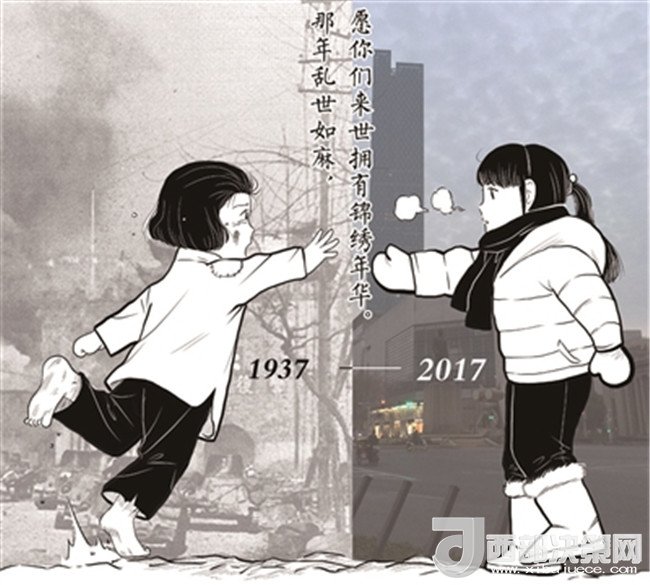 “那年亂世如麻,愿你們來世擁有錦繡年華”。昨日,這句話被許多網(wǎng)友轉(zhuǎn)發(fā)提及,這句話來自于一張漫畫圖,圖中兩名分別來自1937年和2017年的女孩隔空相對(duì),一人身邊戰(zhàn)火紛飛,一人身處和平現(xiàn)代。這幅圖的作者朱彥告訴記者,該圖創(chuàng)作于去年12月,今年有網(wǎng)友把原圖中的2016年換成了2017年,之所以想要畫這張圖,是因?yàn)橄胱尨蠹也灰涍@段歷史,而網(wǎng)友的大量關(guān)注在他們意料之外,“說明我們想表達(dá)的情緒網(wǎng)友感受到了。”