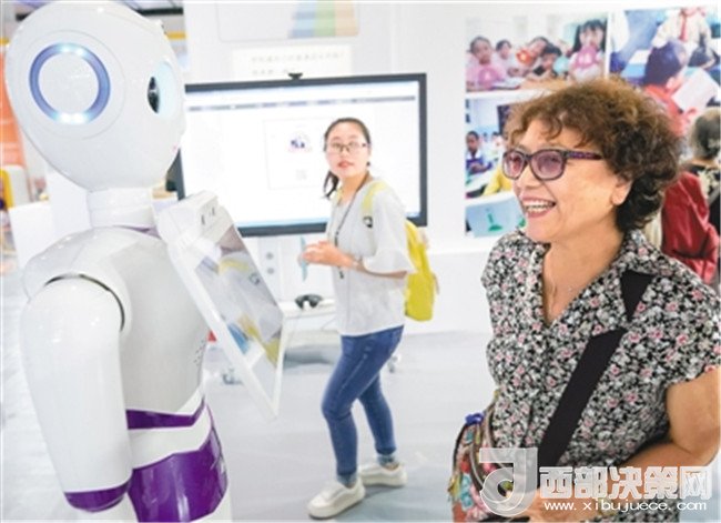 在首屆中國北京國際語言文化博覽會上,一名參觀者與智能客服機(jī)器人交流。 (