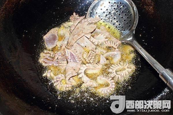 5腰花和肝片用黃酒和淀粉抓勻,等油溫至六成熱時(shí)下鍋滑熟撈出