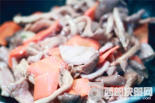 5、等鹽與紅蘿卜和磨菇充分入味后,將炒好的肉片倒入鍋中,一起翻炒,待三種菜的味道相互混合后,關(guān)火出鍋。
