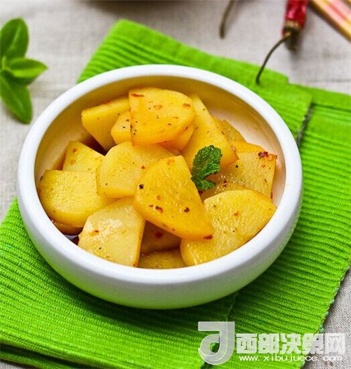 6.將調(diào)料澆入土豆片即可,其實(shí)這個(gè)菜還有一個(gè)做法,可以將調(diào)料中加上高湯和復(fù)合調(diào)料油,將土豆片浸泡,味道更加美,家庭操作通常以簡(jiǎn)單易行為好。