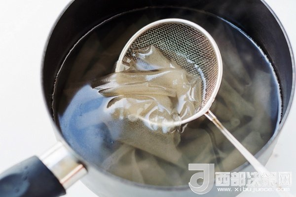 煮鍋里水燒到冒小泡時,把粉皮放進(jìn)煮鍋焯燙到粉皮柔軟透明。